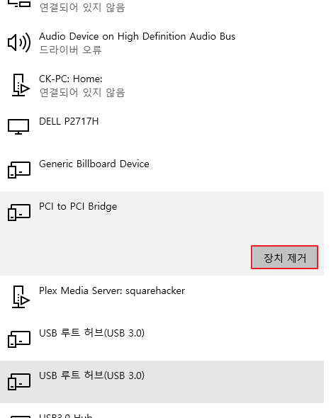 시작 - 설정 - 장치 - PCI to PCI Bridge 를 장치제거를 합니다.