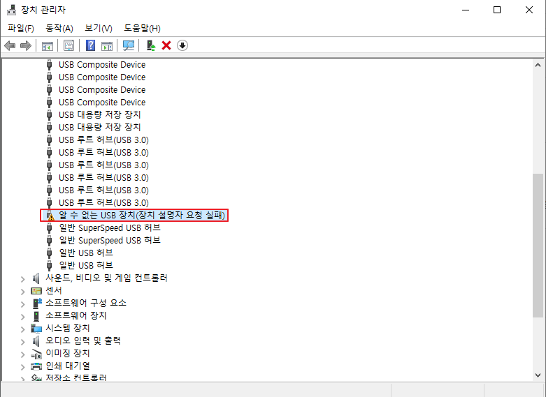 ESP32보드를 PC에 USB로 연결하면 장치관리자에 아래와 같이 알 수 없는 USB장치라는 오류가 발생한다.
