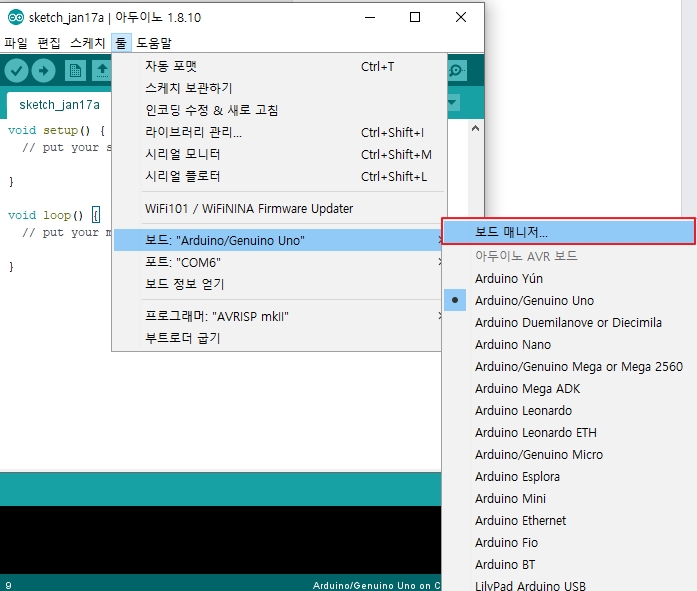 확인을 누른뒤 툴 - 보드 - 보드매니저에 들어갑니다.