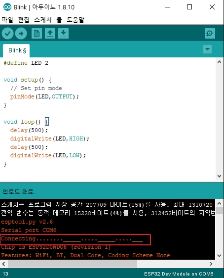 개발보드에서 IO0버튼을 꾹 눌러주면 Connecting에서 다음단계로 이동됩니다.