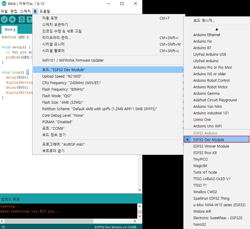 설치가 끝났으면 위와 같이 보드를 ESP32 Dev Module로 설정해줍니다.
