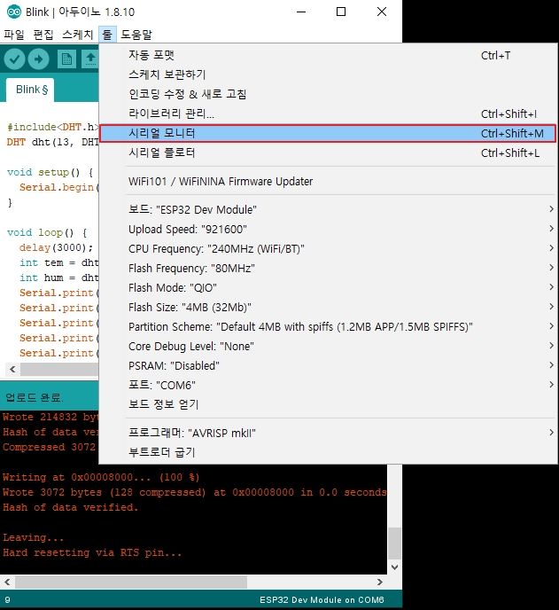 업로드이후 데이터값을 눈으로 보기 위해서는 시리얼모니터를 실행해줘야 함.
