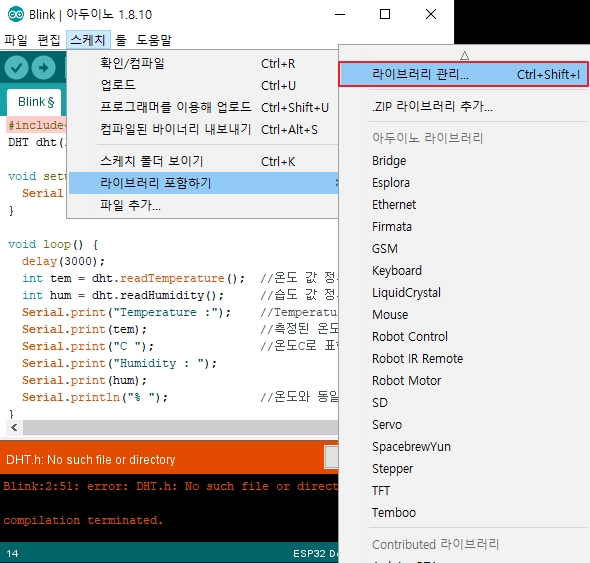 이는 DHT.h라는 라이브러리가 존재하지 않기 때문인데 아래와 같이 따라하면 라이브러리를 추가할 수 있음.