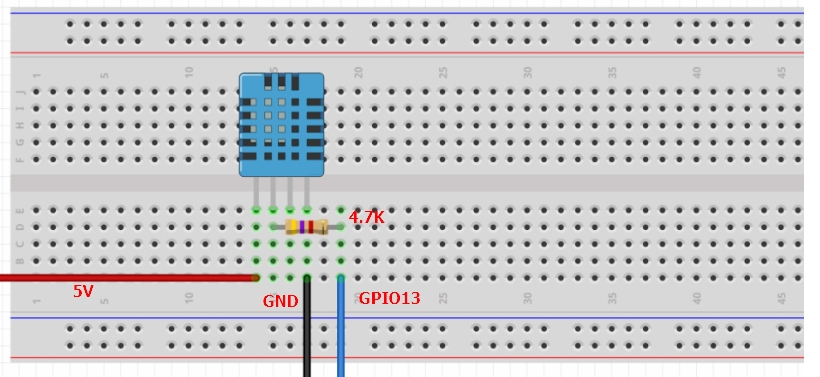 두번째 단자는 4.7K옴의 저항에 연결하고 저항끝단은 GPIO13번에 연결