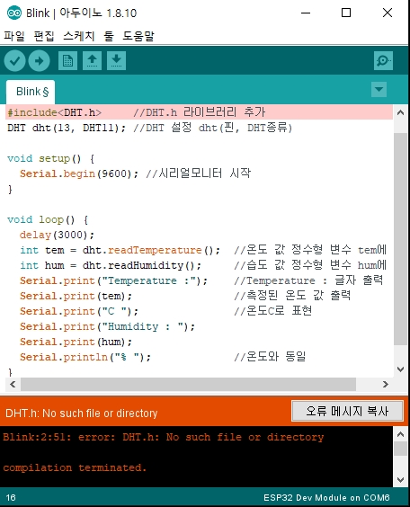 #include<DHT.h> //DHT.h 라이브러리 추가