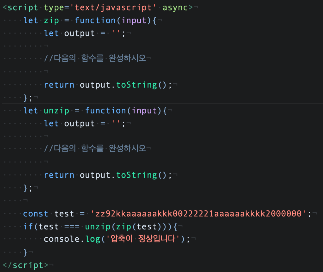 12. zip 함수와 unzip 함수는 문자열을 압축하고 압축된 문자열을 원본으로 복원해주는 함수이다. 속도성능과 관계없이 가장 압축률이 높도록 아래의 함수를 완성하여 제출해주세요 극단적인 압축률을 적용하고 압축된 문자열이 정상적으로 복원되어야 합니다. 아래에 주어진 함수내부의 코드는 변경할 수 없습니다. 압축된 데이터는 문자비트 용량을 계산하지 않고 오직 문자길이만을 갖고 판단합니다. The zip function and the unzip function are functions that compress a string and restore the compressed string to its original state. Regardless of speed performance, please complete and submit the following function for the highest compression rate Extreme compression rates must be applied and compressed strings restored normally. You cannot change the code inside the function given below. Compressed data is judged only by character length, not by character bit capacity.