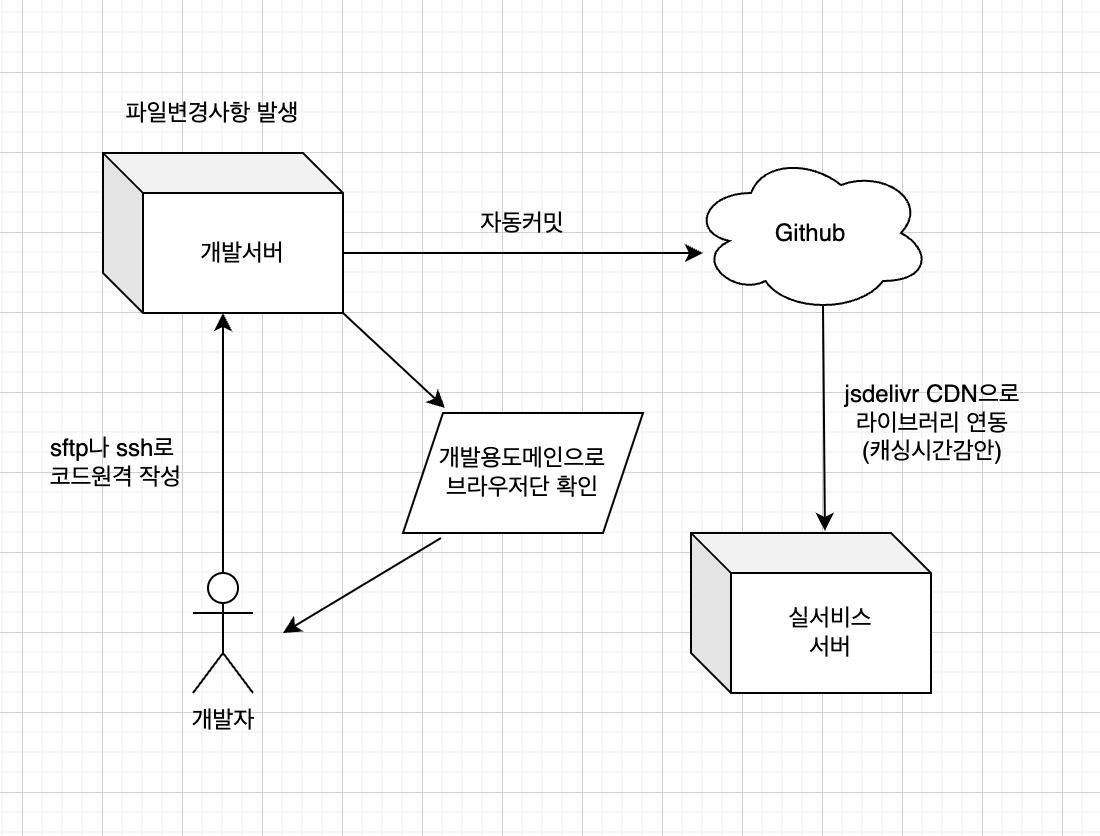 단위기능수정 -> 컴포넌트 수정사항발생 -> 로컬에서 개발 및 테스트 -> git커밋 -> CDN으로 실서버에 배포