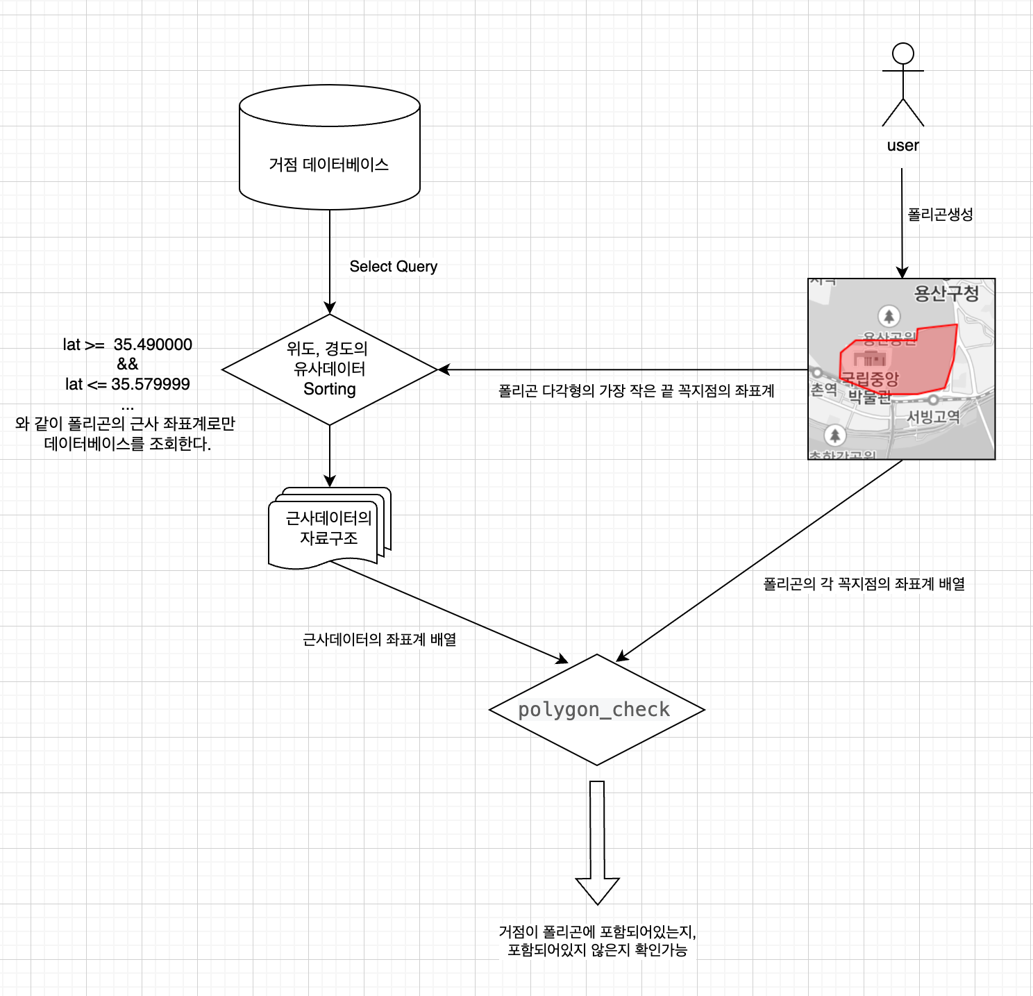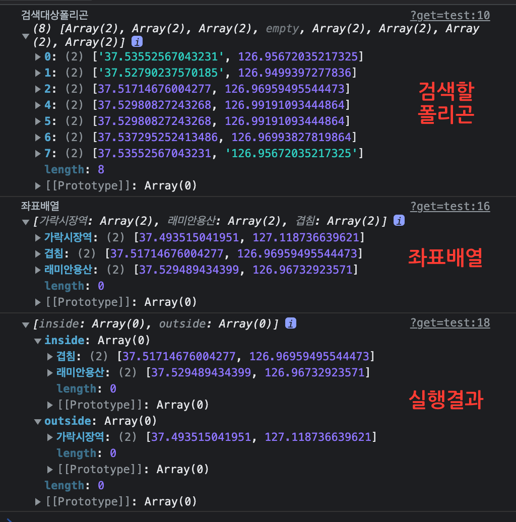 기본적으로 Tmap이나 Naver Map에서는 설정한 폴리곤영역에서 사전에 맵에 띄워둔 마커가 폴리곤에 포함되어있는지 확인하는 API가 존재했지만,이 과정은 언제까지나 매번 API를 통해 호출해야되는 부담이 있었고,