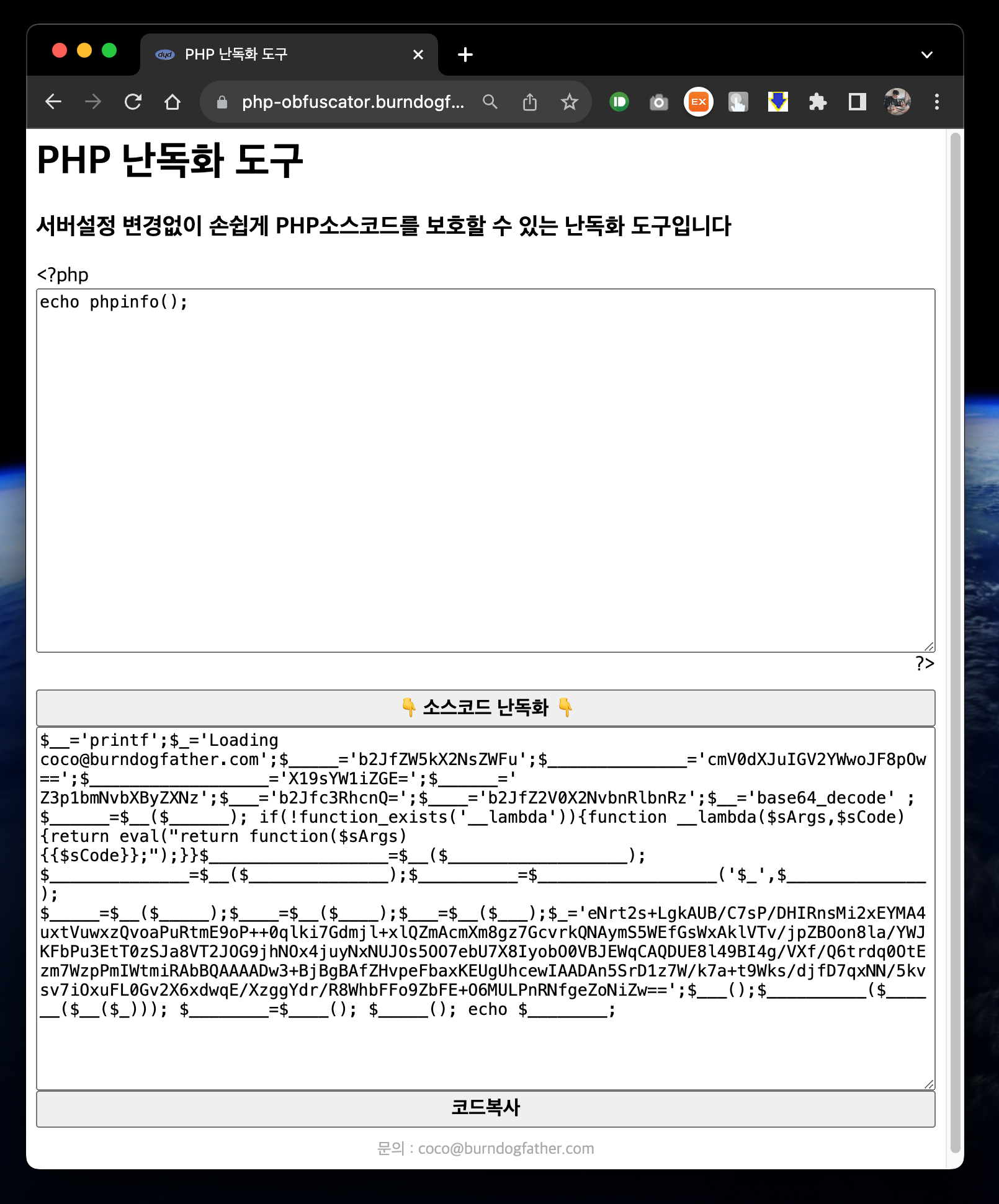 간단하게 php소스코드를 읽지 못하도록 난독화하는 사이트를 개설하게 되어 공유합니다.