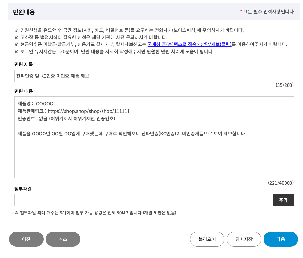 4. 민원내용에 "전파인증 또는 KC인증 미인증제품 제보"로 적고 민원내용에는 아래와 같이 작성