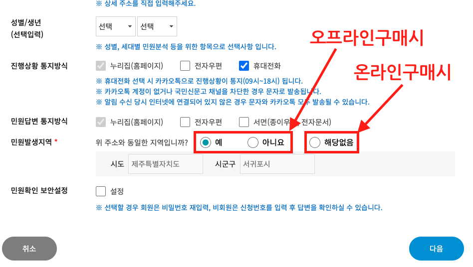 2. 신청인 기본정보와 민원발생지역을 오프라인인지 온라인 인지에 따라 선택