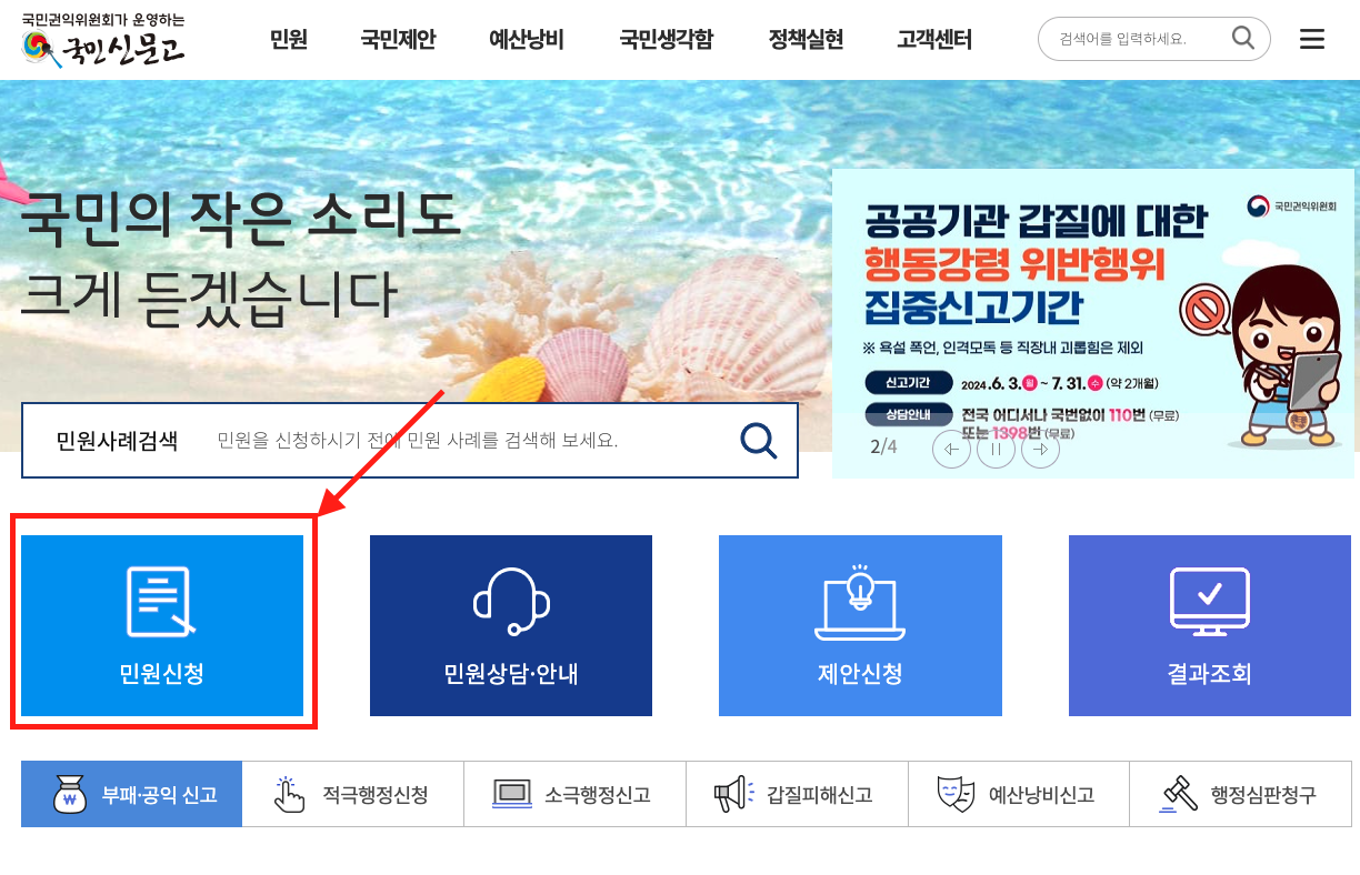 1. 국민신문고 로그인 또는 회원가입 후 "민원신청" 클릭