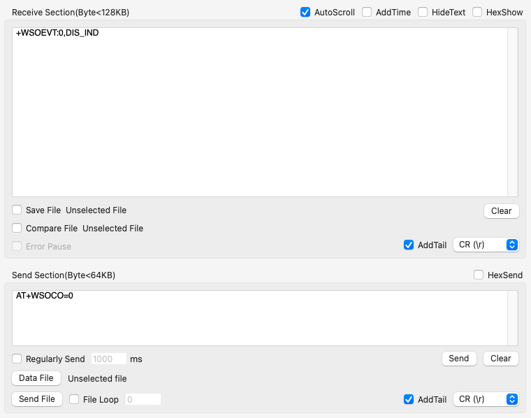 AT+WSOCO=0 #소켓서버연결, 연결성공시 OPEN_CMPL반환, 실패시 OPEN_FAIL반환