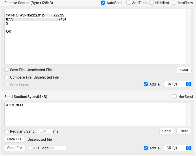아래는 WD-N522S에서 AT Command로 TCP서버에 연결하고 데이터를 보내고 받는 예시이다.