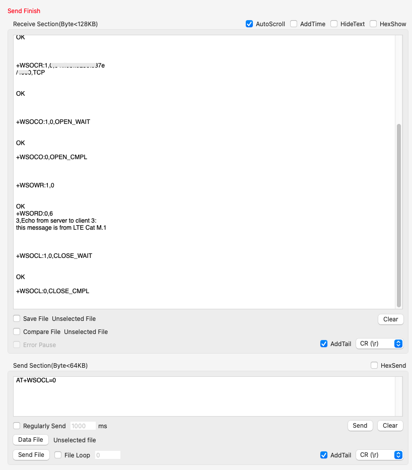 AT+WSOWR=0,33,this message is from LTE Cat M.1 #데이터전송, 성공시 OK반환