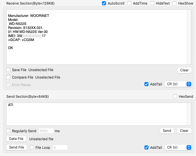 (엉뚱한 시리얼 포트 연결하고 AT Command 전송해도 응답이 없으니 주의바람)