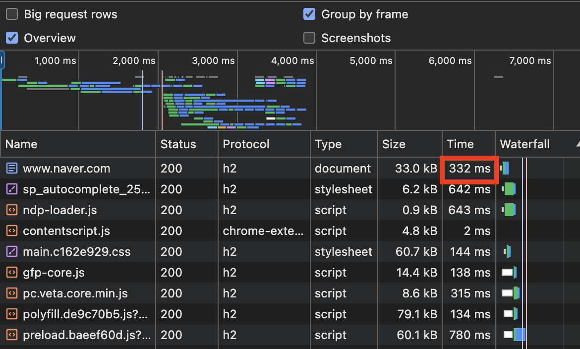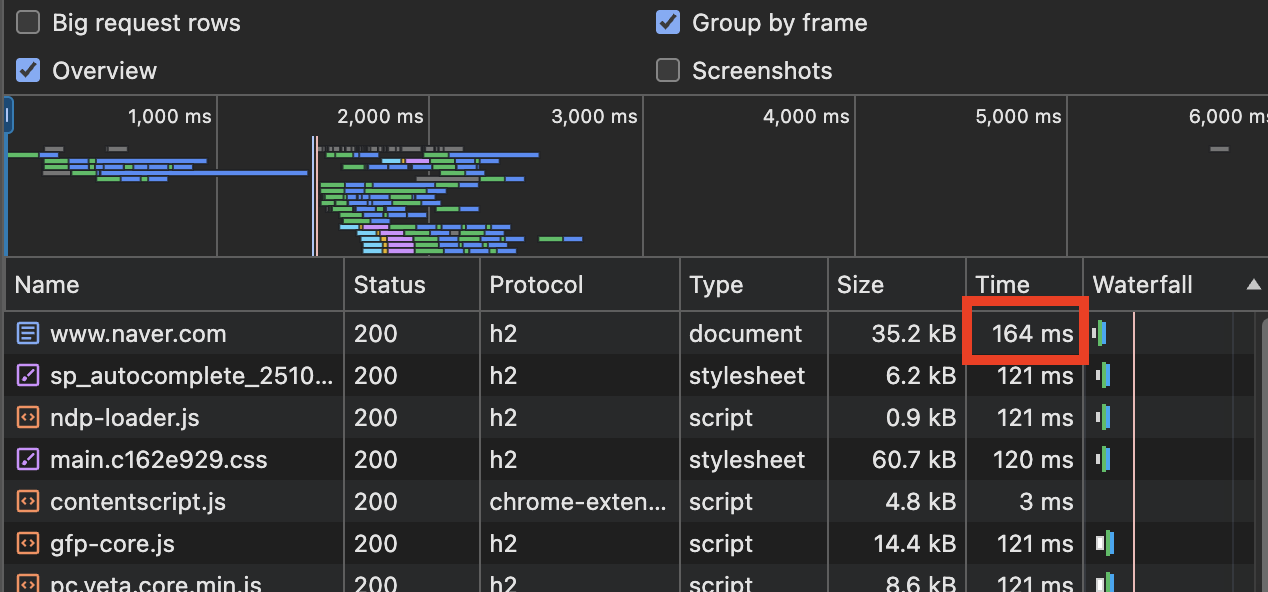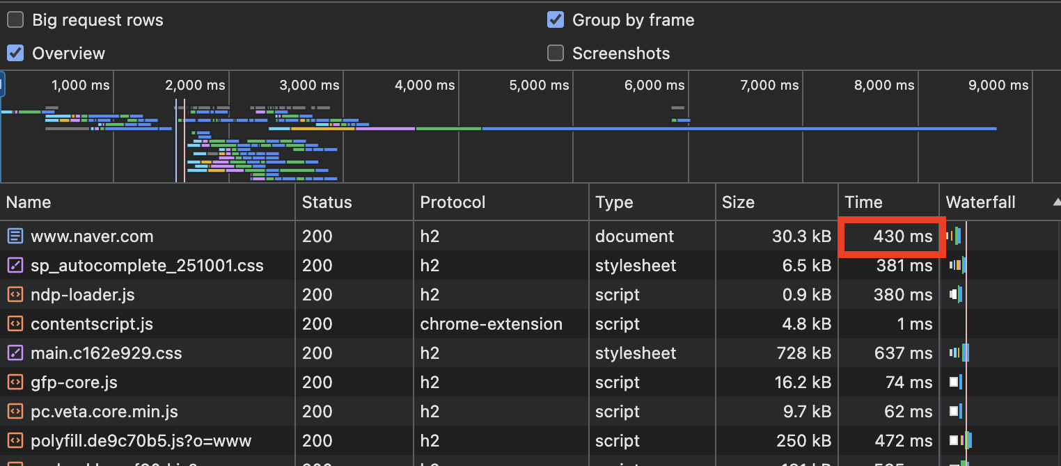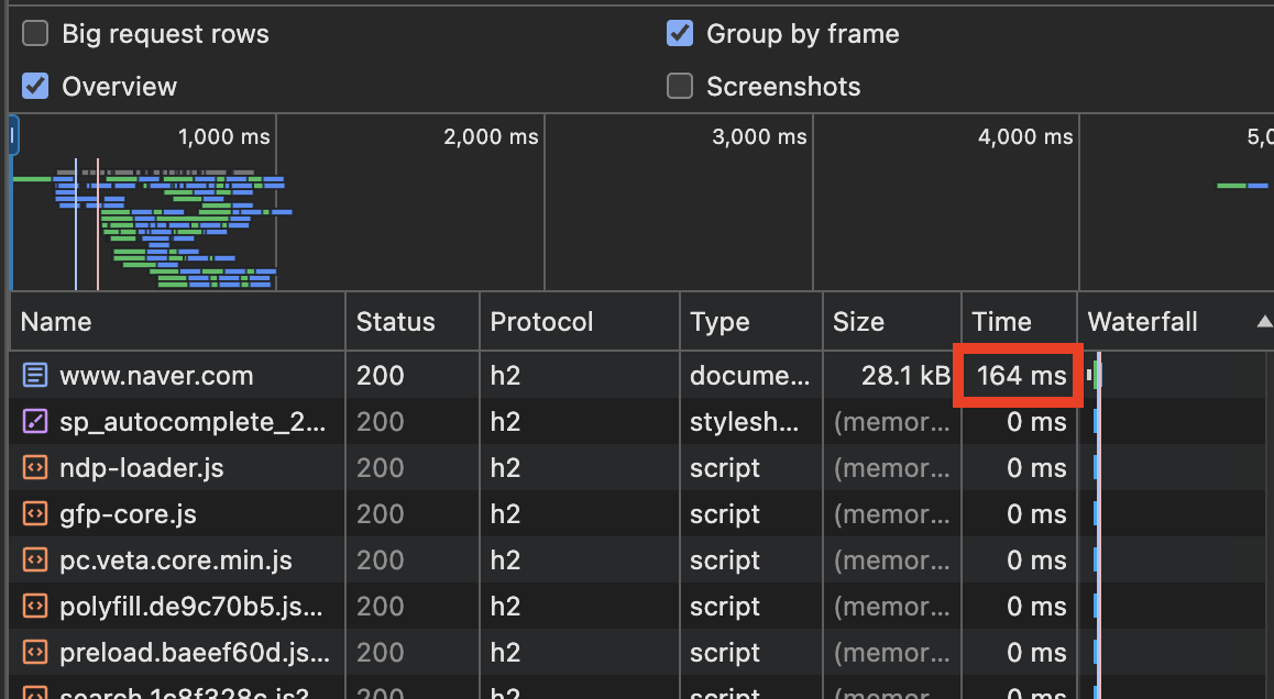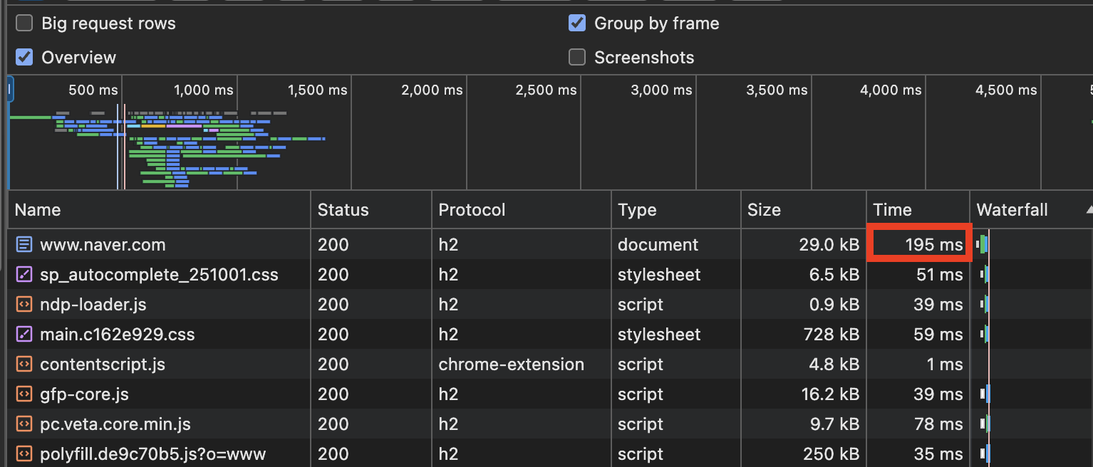 | 네이버메인 Document Waterfall 비교 (낮을수록좋음) |
