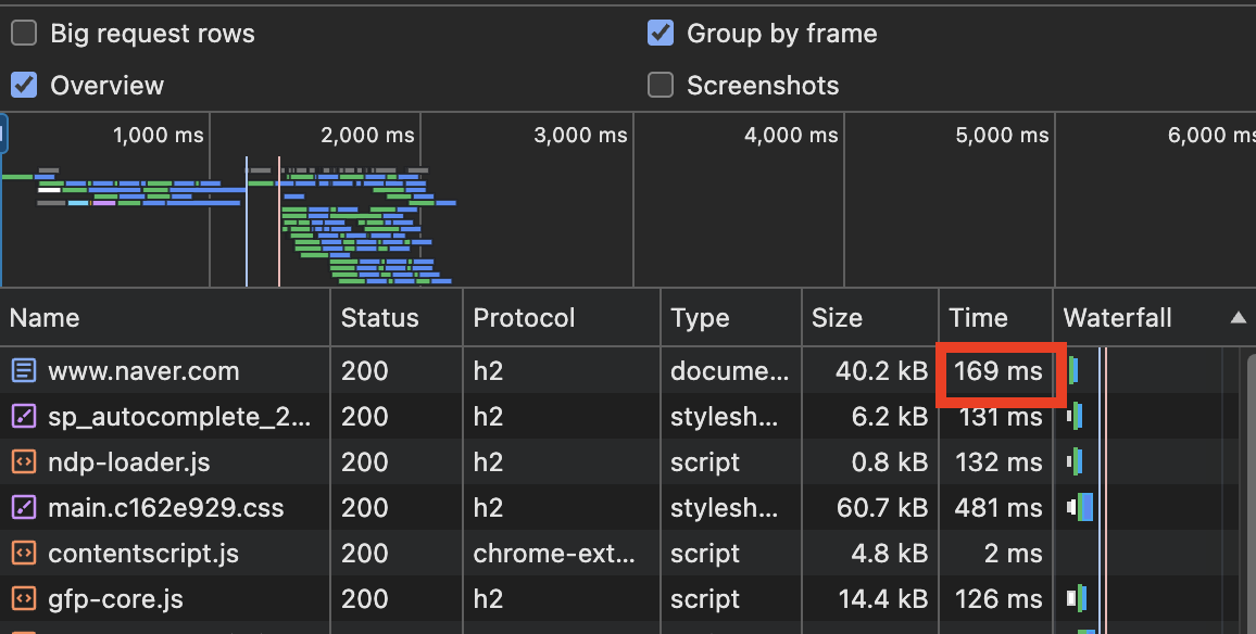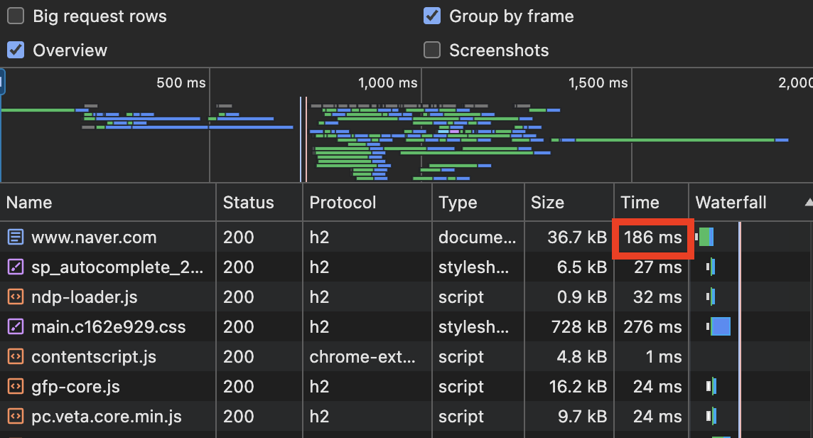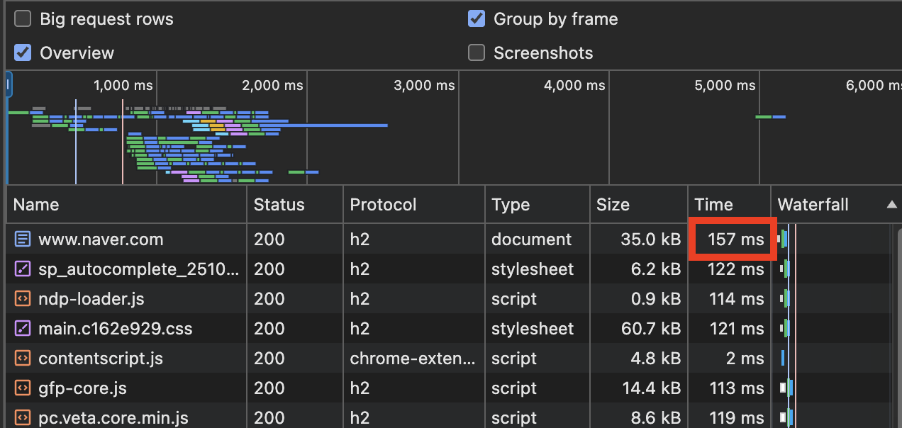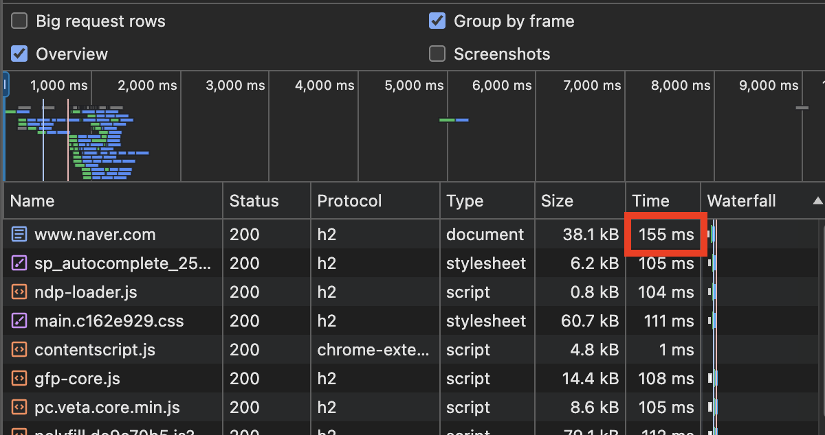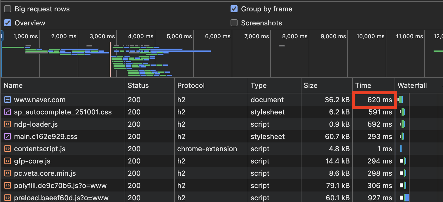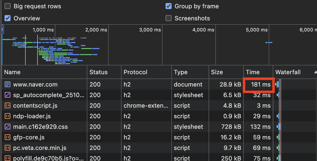 | 네이버메인 Document Waterfall 비교 (낮을수록좋음) |