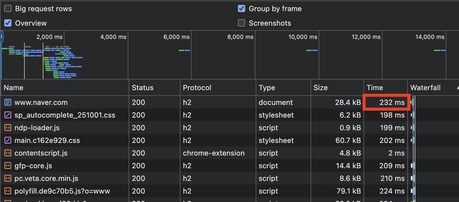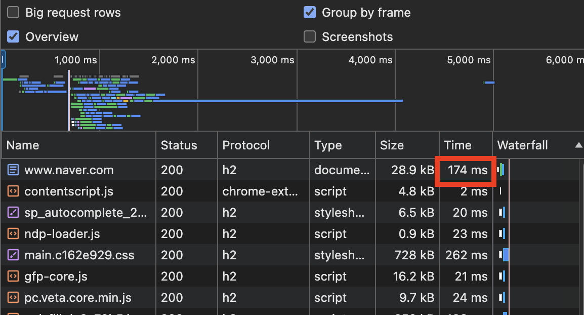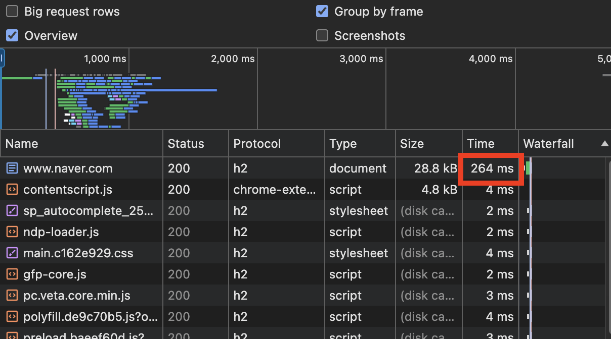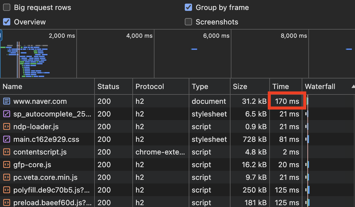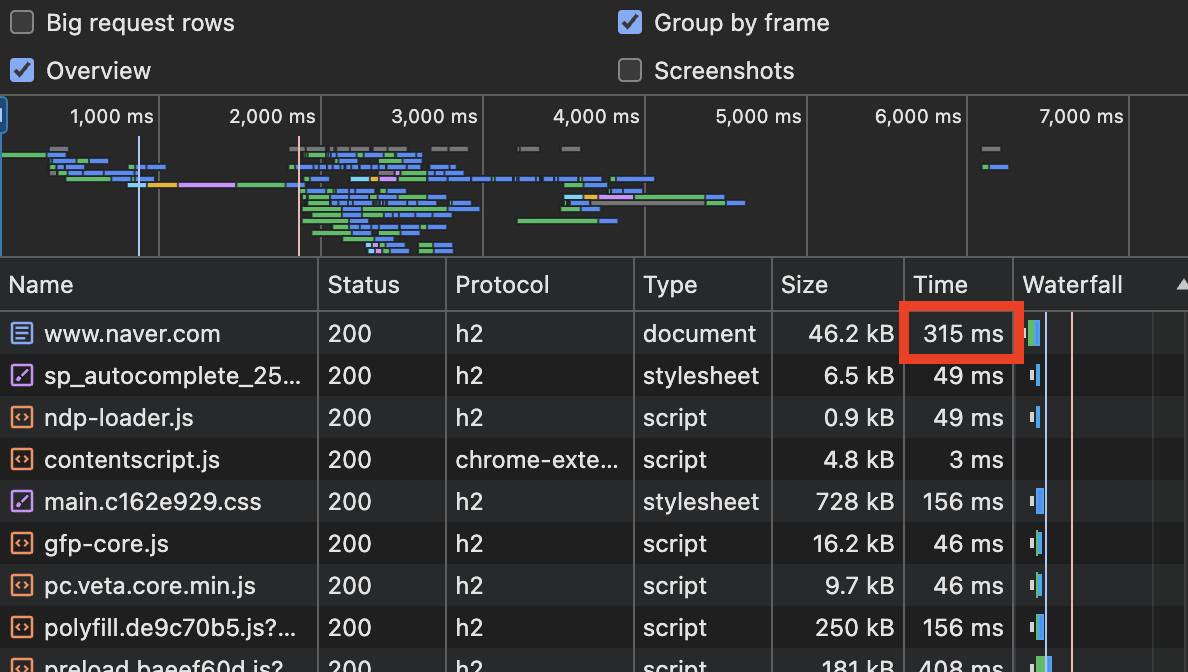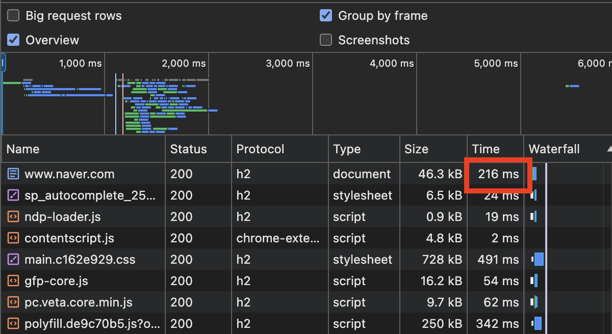 | 네이버메인 Document Waterfall 비교 (낮을수록좋음) |