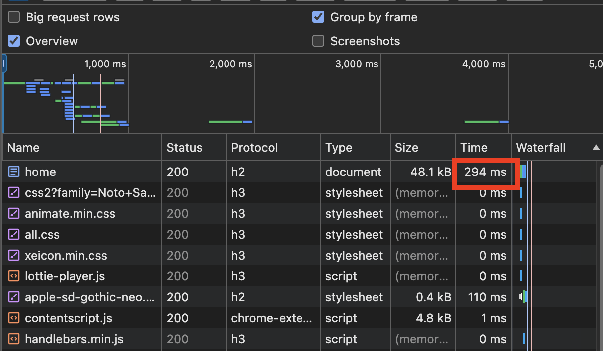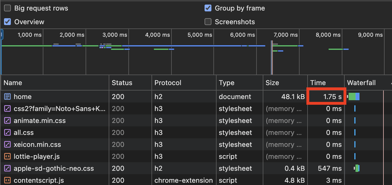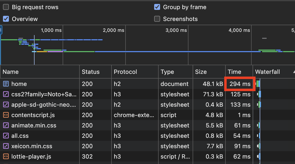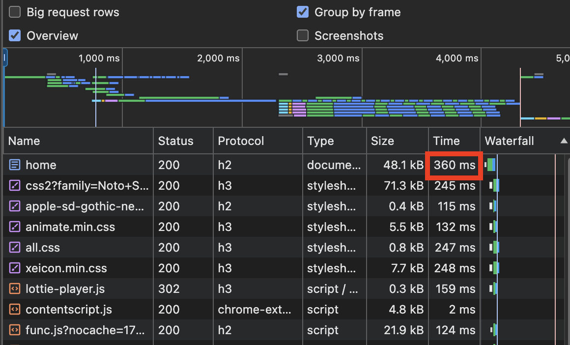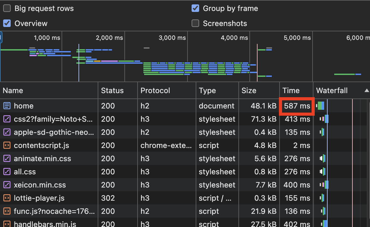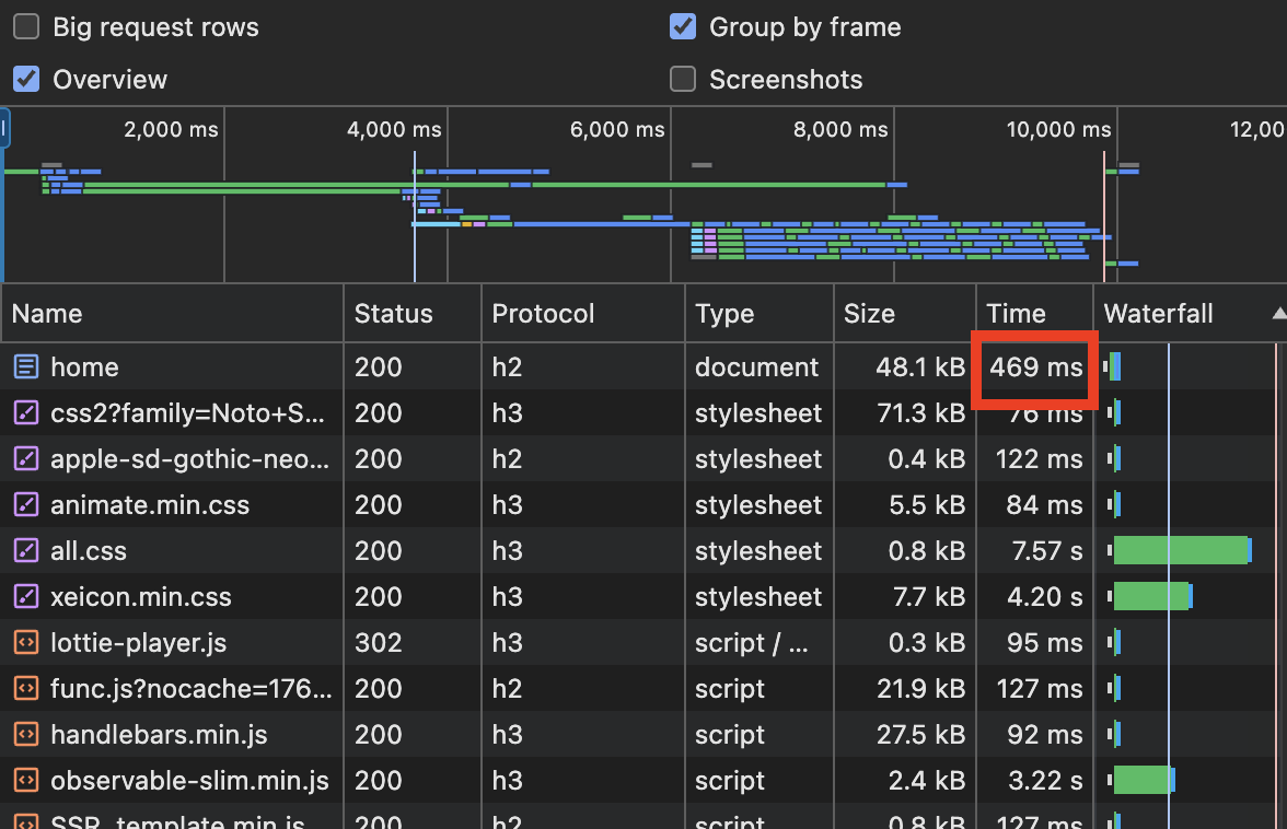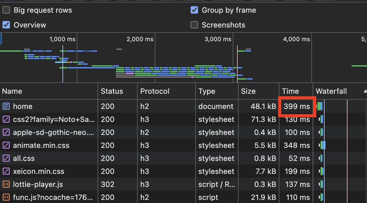 | 자사서버 Waterfall 비교 | 웹서비스내 Document 레이턴시 비교 (KT망-대전, on-premise단독, MTU최적화X, 48KB 용량) |