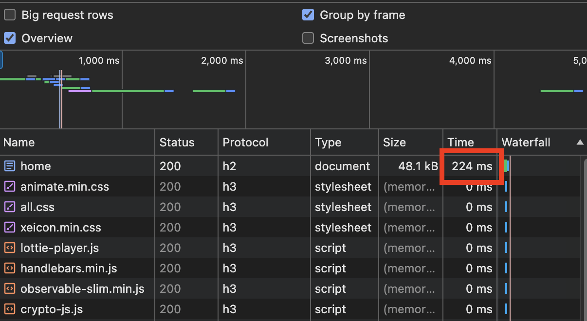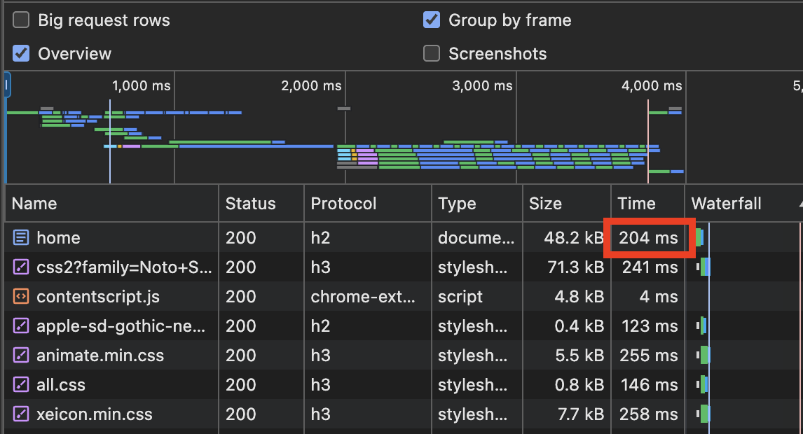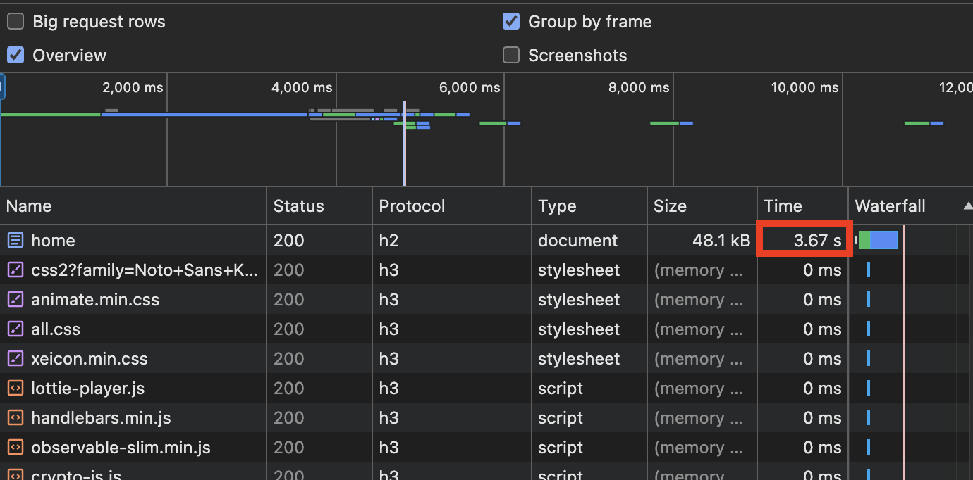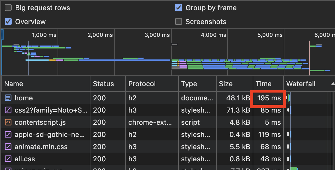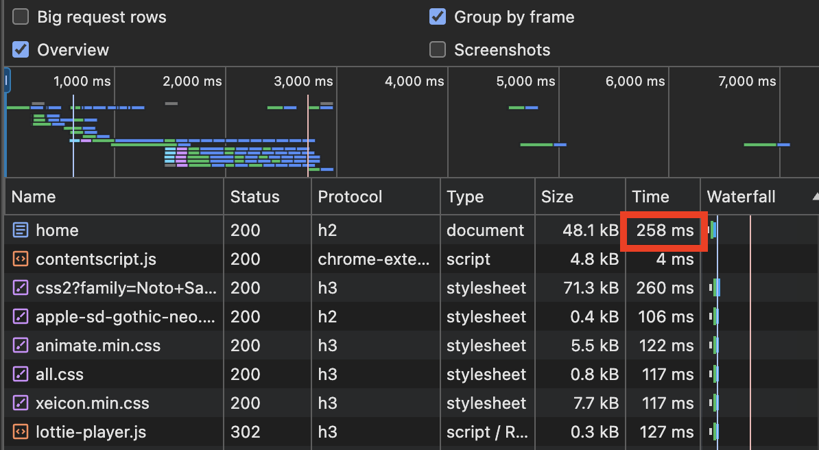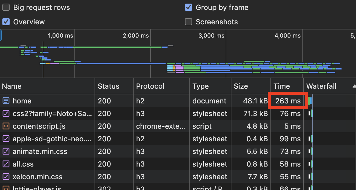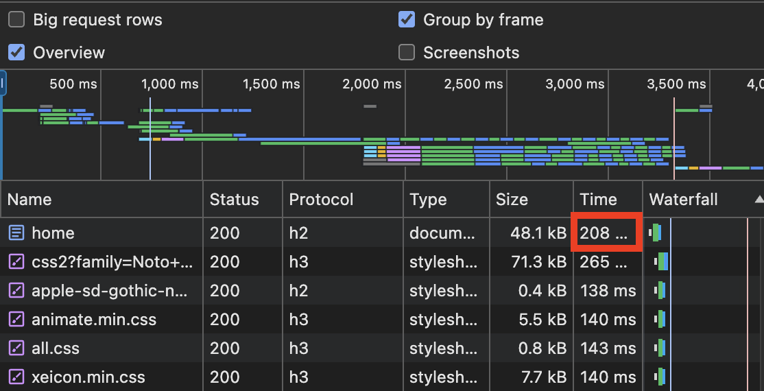 | 자사서버 Waterfall 비교 | 웹서비스내 Document 레이턴시 비교 (KT망-대전, on-premise단독, MTU최적화X, 48KB 용량) |
