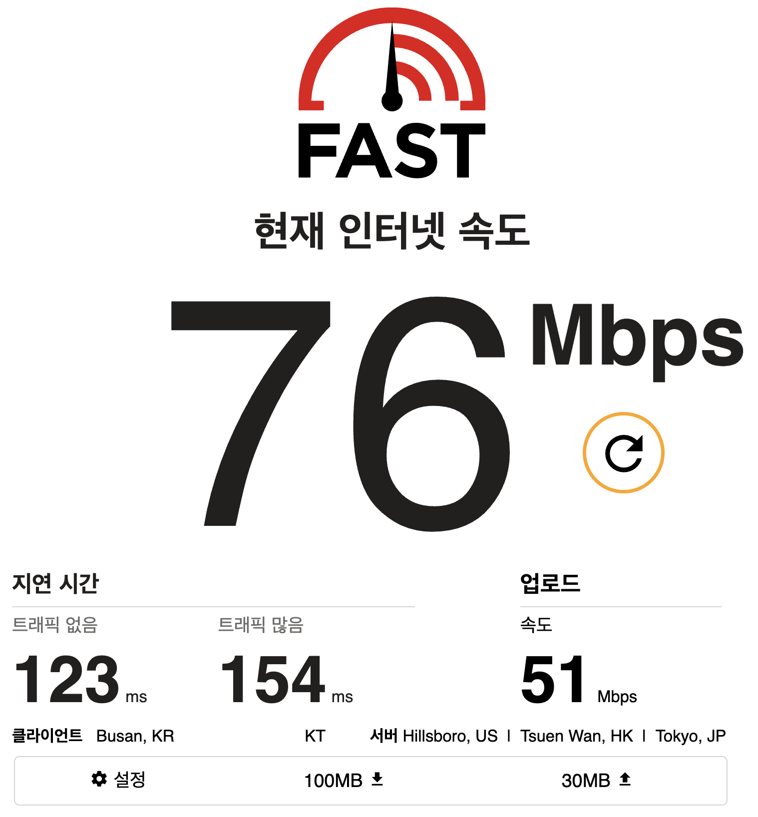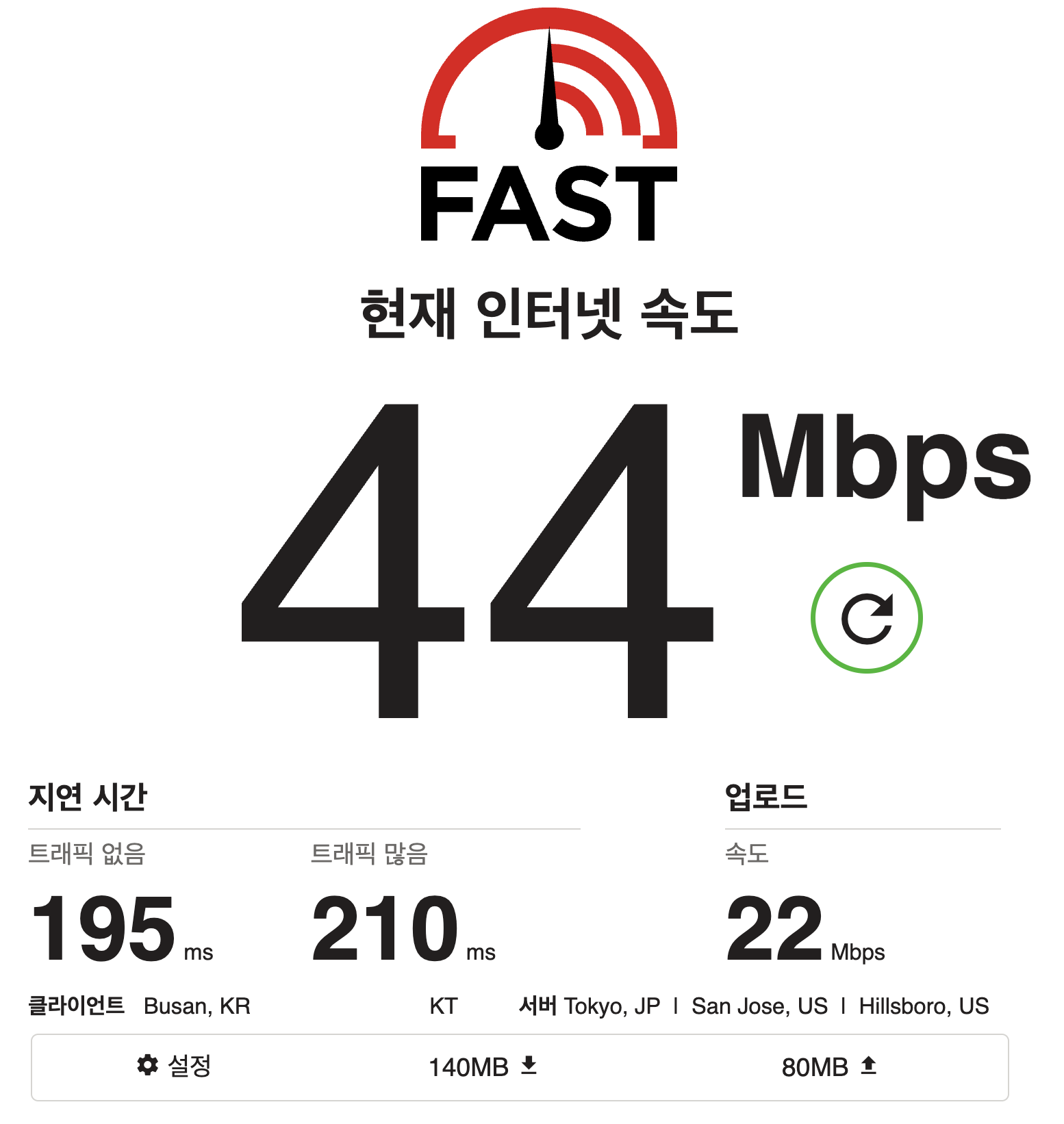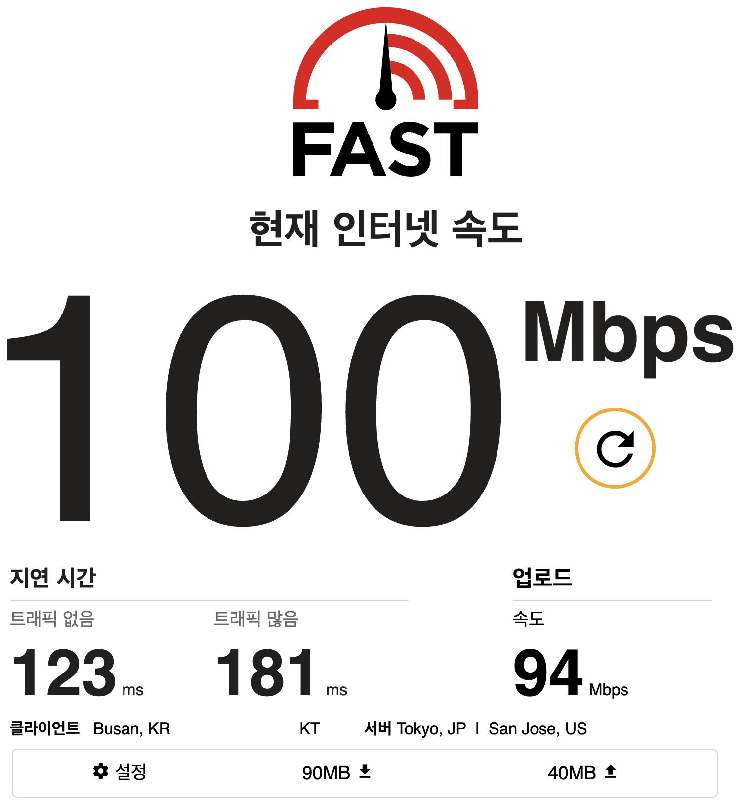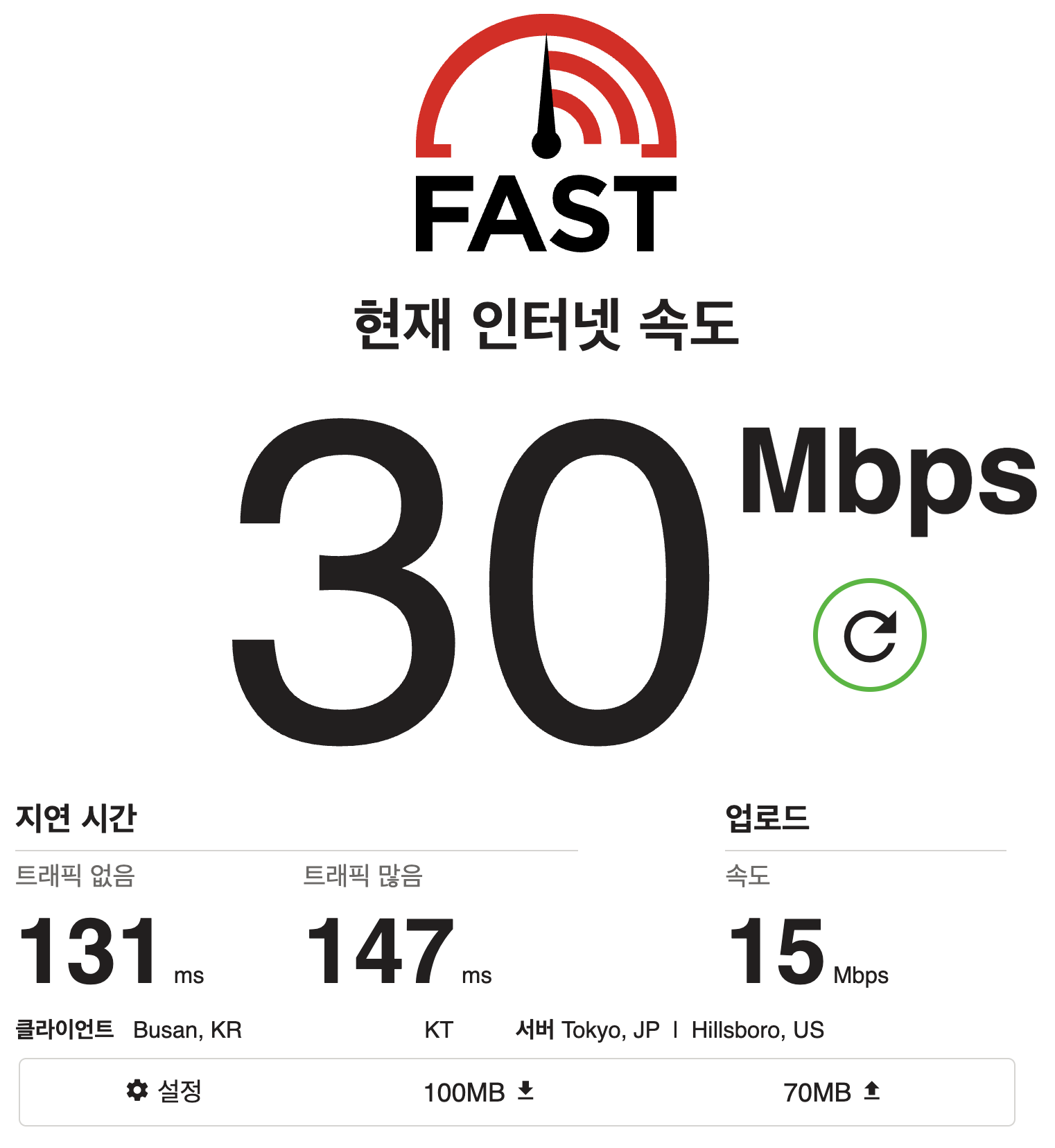 속도요약 : 괜찮은 레이턴시와 한국의 100M 광랜급 대역폭