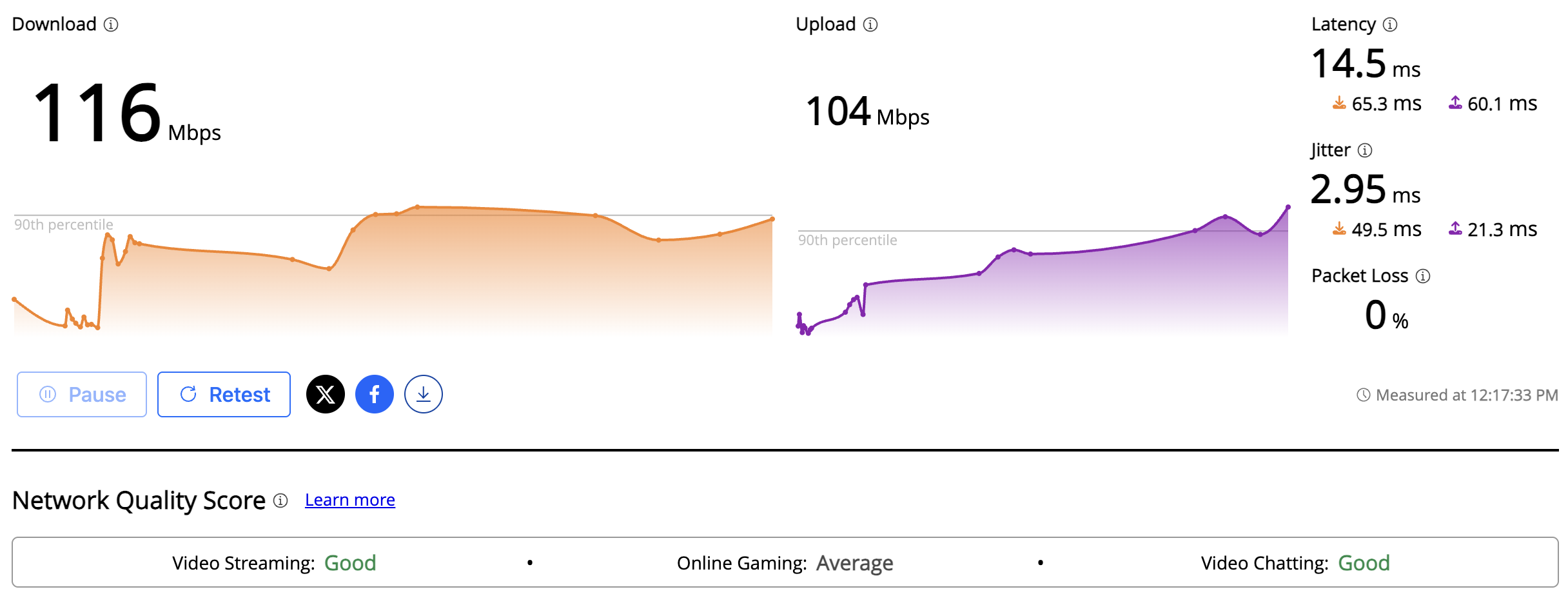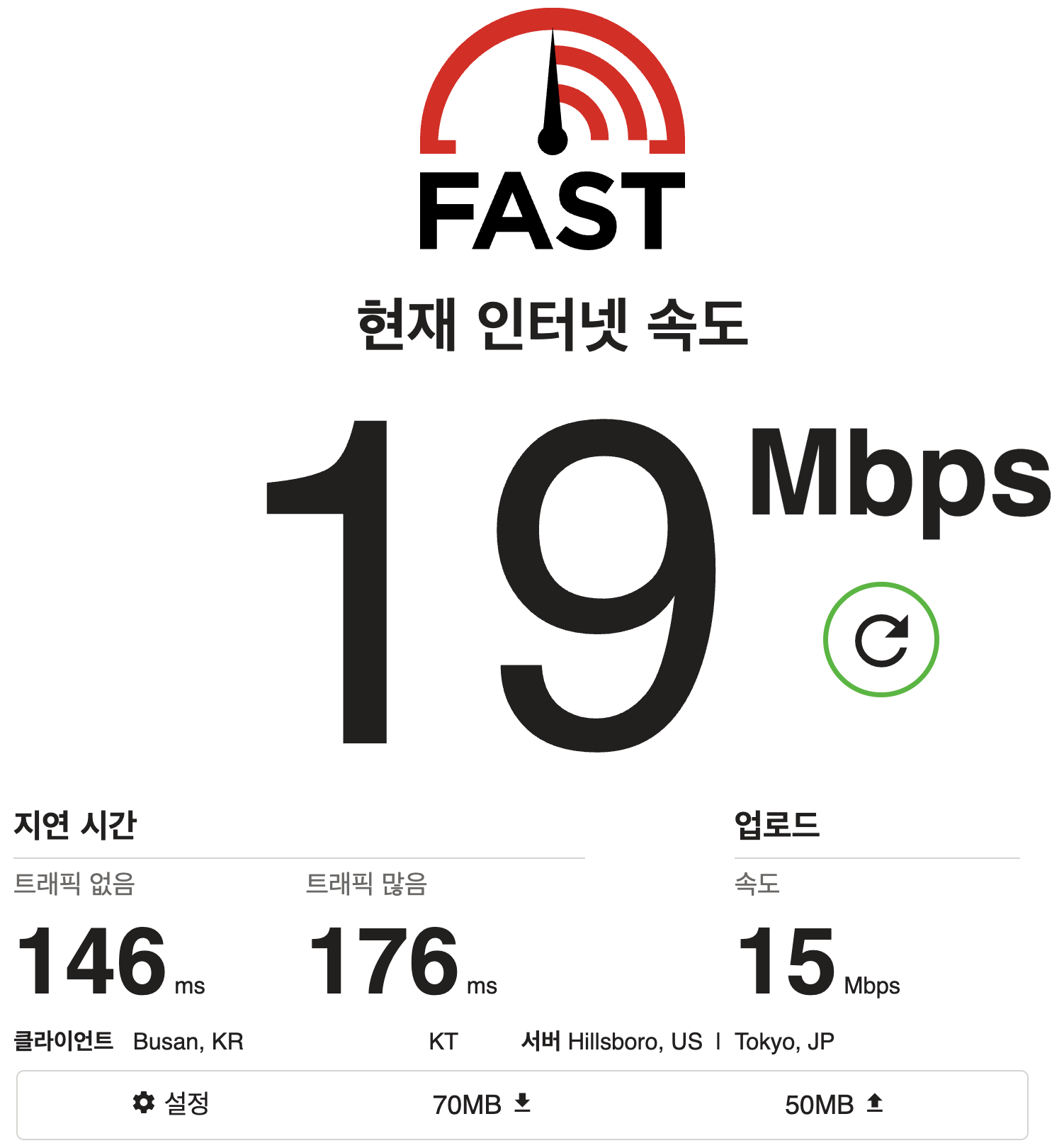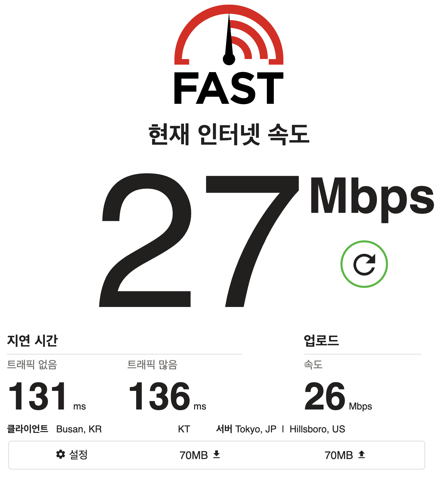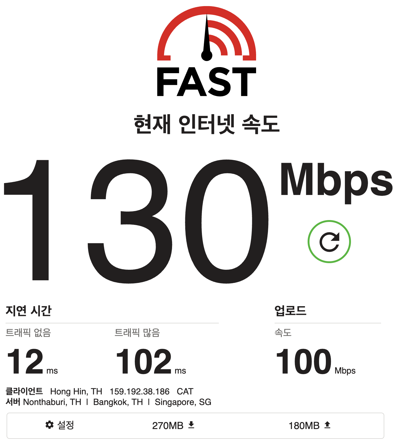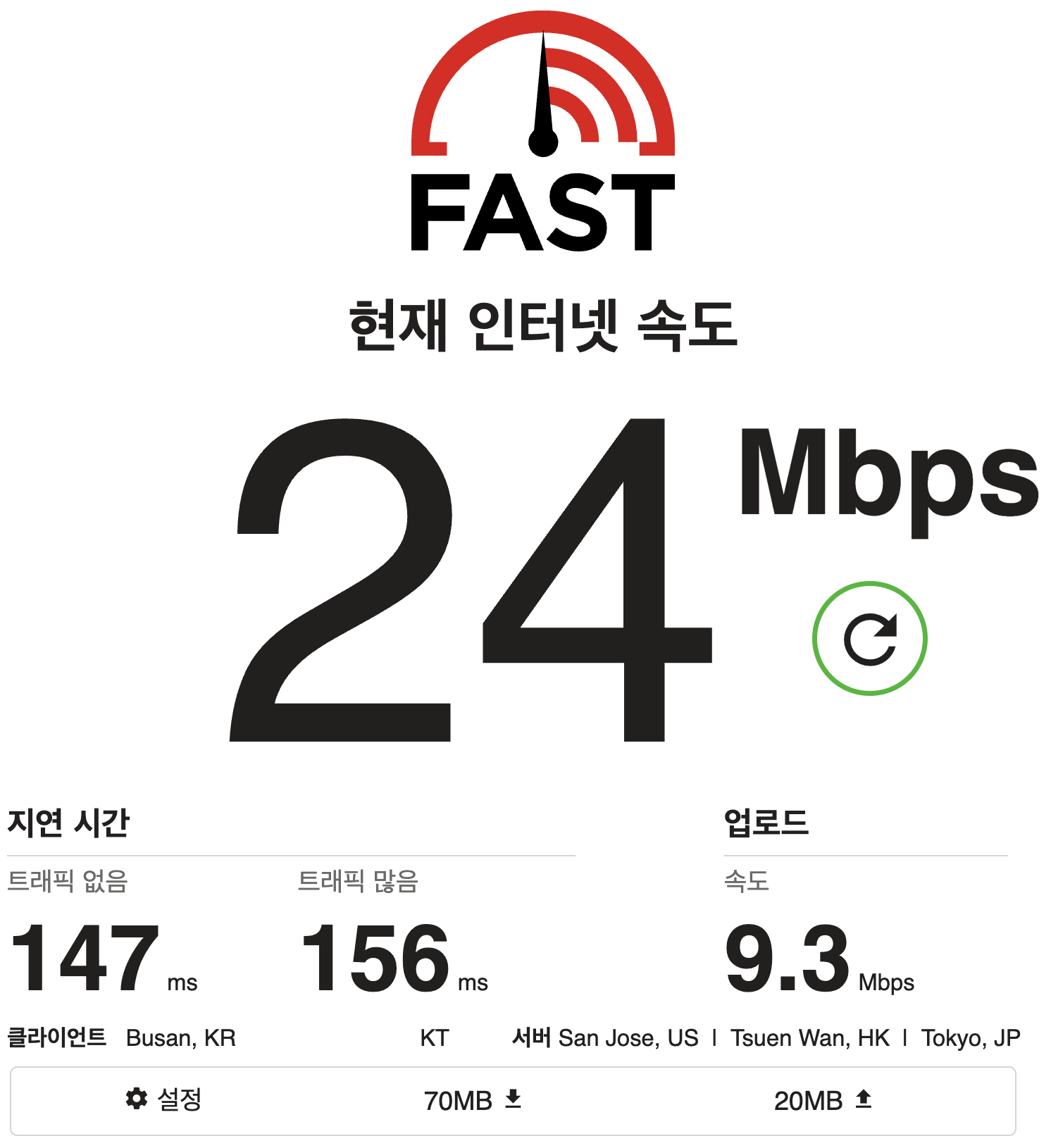 속도요약 : 괜찮은 레이턴시와 한국의 100M 광랜급 대역폭