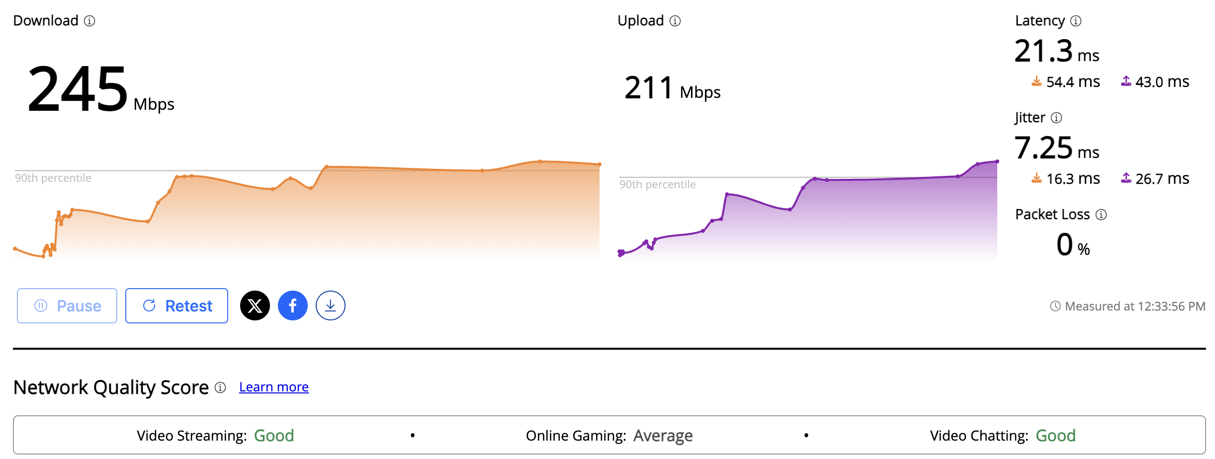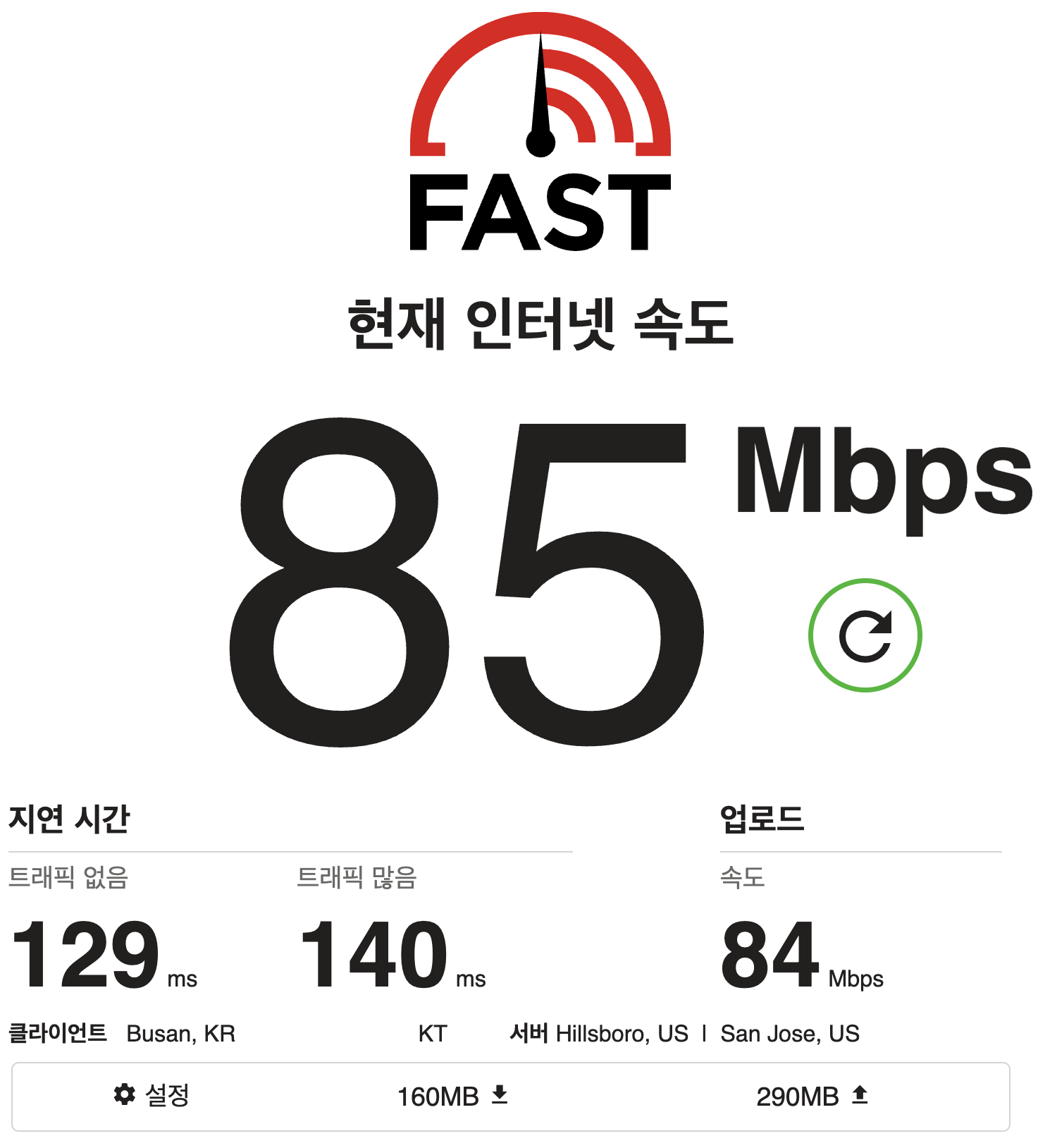 | 직결 인터넷 대역폭(속도) | ★★★☆☆ (Avg. 84.2Mbps ≈ 10.5MB/s) |