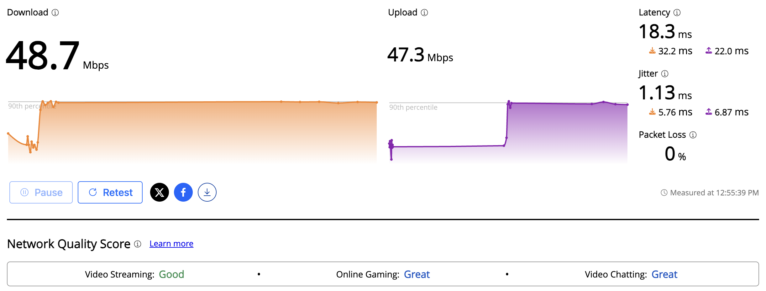 | 시설 이용후기 | 아마 4Seas Nimman과 완벽하게 정반대의 성향의 워킹스페이스가 아닐까 싶다. 외진 골목안에 있으면서 사람도 없고, 정말 고요하다. 하루 이용료는 ฿249으로 다소 비싼편은 흠. 1일 이용권을 구매하고 구글후기와 인스타그램을 팔로워하면 1층 카페의 전체 음료중 한가지를 무료로 마실 수 있다. 인근의 님만해민 소재의 다른 워킹스페이스와 같이 UniFi UDM을 사용하고 있으며, 굉장히 특이하게도 2회선을 Active-Active로 구성되어 있다. Cloudflare Speedtest의 대역폭 그래프를 보았을때 인터넷 대역폭에 대한 QoS는 약 50Mbps선에 걸려있지만, 이중화 회선구성 덕분에 레이턴시는 정말 최고였다. 이 정도면 국내상황보다 오히려 더 좋은 경우가 생길 수 있을 정도! |